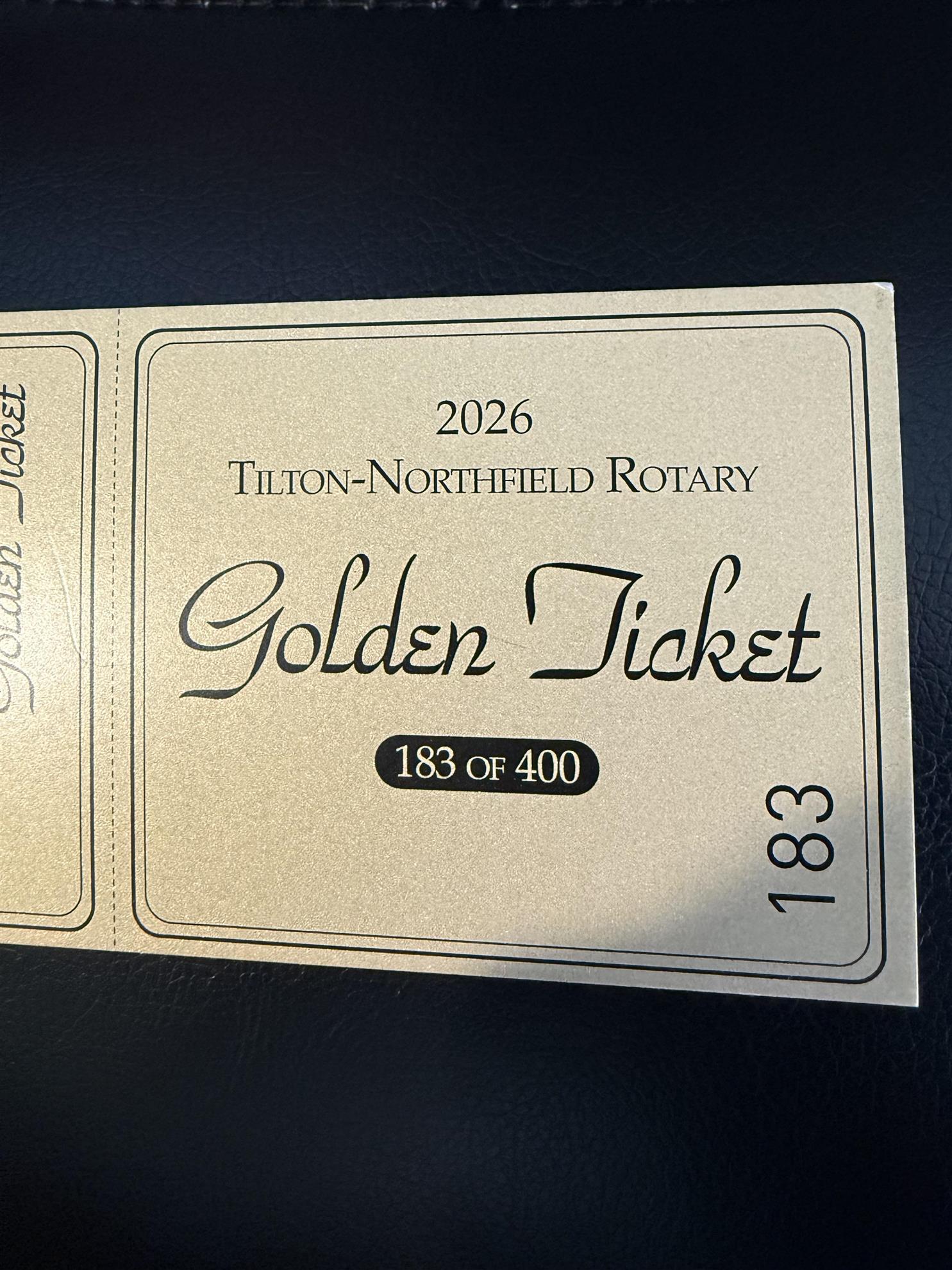 It’s that time of year again! The “Golden Ticket”! This is your chance to possibly win $10,000 dollars! Tickets are available NOW from any of the Tilton-Northfield Rotary members. $100 per ticket. You’ll have a 1 in 200 chance of winning! Message us or contact a Tilton-Northfield Rotary member today to purchase your ticket. These tickets don’t hang around long so you better hurry and get in on this opportunity while it last! Thank you and good luck! Drawing will be held on November 15th 2023.